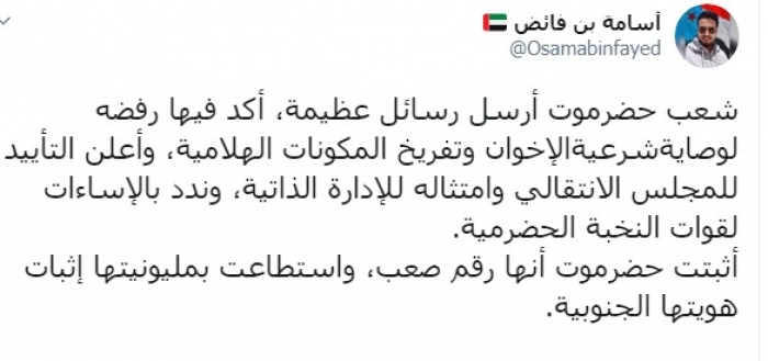 وكتب عبر تغريدة له على "تويتر" رصدها "المشهد العربي": "شعب حضرموت أرسل رسائل عظيمة، أكد فيها رفضه لوصاية شرعية الإخوان وتفريخ المكونات الهلامية، وأعلن التأييد للمجلس الانتقالي وامتثاله للإدارة الذاتية، وندد بالإساءات لقوات النخبة الحضرمية".