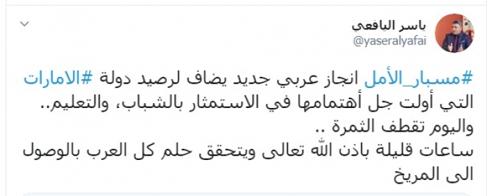 وكتب عبر تغريدة له على "تويتر" رصدها "المشهد العربي": "مسبار الأمل إنجاز عربي جديد يضاف لرصيد دولة الإمارات التي أولت جل اهتمامها في الاستثمار بالشباب، والتعليم واليوم تقطف الثمرة".