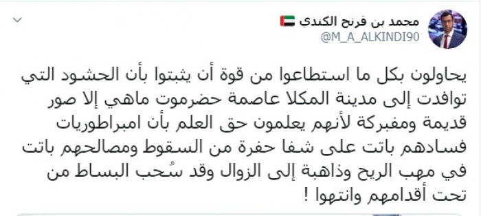 وكتب عبر تغريدة له على "تويتر" رصدها "المشهد العربي": "يحاولون بكل ما استطاعوا من قوة أن يثبتوا بأن الحشود التي توافدت إلى مدينة المكلا عاصمة حضرموت ماهي إلا صور قديمة ومفبركة ،لأنهم يعلمون حق العلم بأن إمبراطوريات فسادهم باتت على شفا حفرة من السقوط ومصالحهم باتت في مهب الريح وذاهبة إلى الزوال وقد سُحب البساط من تحت أقدامهم وانتهوا".