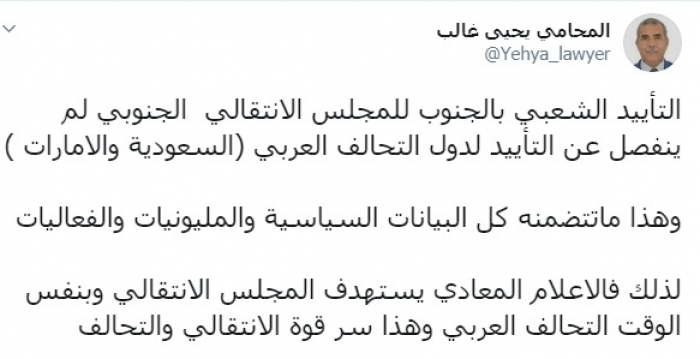 وكتب عبر تغريدة له على "تويتر" رصدها "المشهد العربي": "التأييد الشعبي بالجنوب للمجلس الانتقالي الجنوبي لم ينفصل عن التأييد لدول التحالف العربي (السعودية والإمارات)،وهذا ما تتضمنه كل البيانات السياسية والمليونيات والفعاليات، لذلك فالإعلام المعادي يستهدف المجلس الانتقالي وبنفس الوقت التحالف العربي وهذا سر قوة الانتقالي والتحالف".