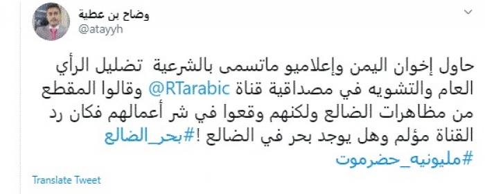 وقال في تغريدة عبر "تويتر" رصدها "المشهد العربي": "حاول إخوان اليمن وإعلاميو ما تسمى بالشرعية تضليل الرأي العام والتشويه في مصداقية قناة روسيا".