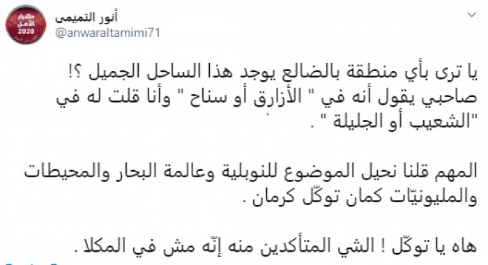 وقال في تغريدة عبر "تويتر" رصدها "المشهد العربي": "يا ترى بأي منطقة بالضالع يوجد هذا الساحل الجميل؟ صاحبي يقول أنه في الأزارق أو سناح وأنا قلت له في الشعيب أو الجليلة".