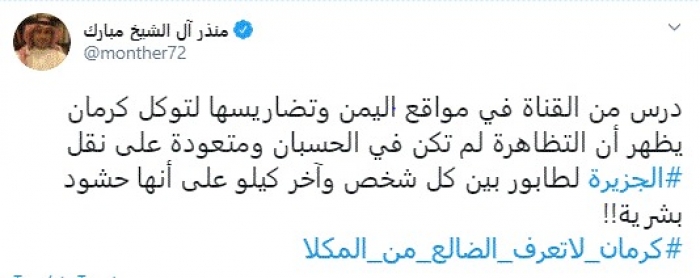 وكتب في تغريدة عبر "تويتر" رصدها "المشهد العربي": "درس من القناة في مواقع اليمن وتضاريسها لتوكل كرمان يظهر أن التظاهرة لم تكن في الحسبان ومتعودة على نقل الجزيرة لطابور بين كل شخص وآخر كيلو على أنها حشود بشرية".