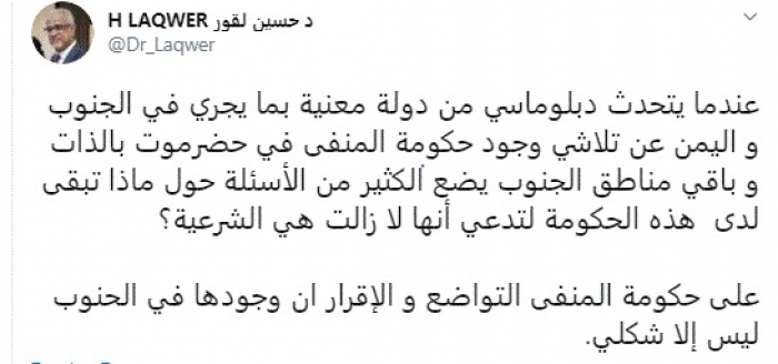 وقال في تغريدة عبر "تويتر" رصدها "المشهد العربي": "عندما يتحدث دبلوماسي من دولة معنية بما يجري في الجنوب واليمن عن تلاشي وجود حكومة المنفى في حضرموت بالذات و باقي مناطق الجنوب يضع الكثير من الأسئلة حول ماذا تبقى لدى هذه الحكومة لتدعي أنها لا زالت هي الشرعية؟".