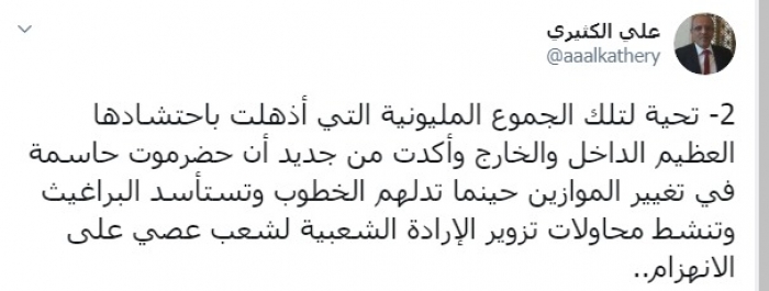 وأضاف: "تحية لتلك الجموع المليونية التي أذهلت باحتشادها العظيم الداخل والخارج وأكدت من جديد أن حضرموت حاسمة في تغيير الموازين حينما تدلهم الخطوب وتستأسد البراغيث وتنشط محاولات تزوير الإرادة الشعبية لشعب عصي على الانهزام".