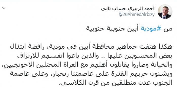 وكتب عبر تغريدة له على "تويتر" رصدها "المشهد العربي": "من مودية أبين جنوبية جنوبية، هكذا هتفت جماهير محافظة أبين في مودية، رافضة ابتذال بعض المحسوبين عليها، والذين باعوا أنفسهم للارتزاق والخيانة وصاروا يقاتلون أهلهم مع الغزاة المحتلين الإخونجيين، ويشنون حربهم القذرة على عاصمتنا زنجبار، وعلى عاصمة الجنوب عدن منطلقين من قرن الكلاسي".