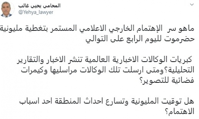طرح الناشط السياسي المحامي يحيى غالب، اليوم، تساؤلات بشأن الاهتمام الخارجي الإعلامي لتغطية مليونية حضرموت.