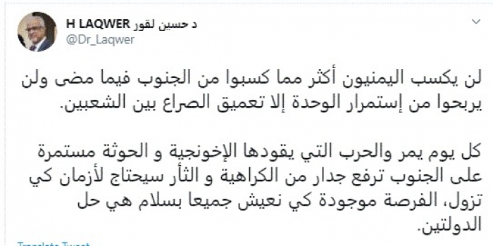 وقال في تغريدة عبر "تويتر" رصدها "المشهد العربي": "لن يكسب اليمنيون أكثر مما كسبوا من الجنوب فيما مضى ولن يربحوا من استمرار الوحدة إلا تعميق الصراع بين الشعبين".