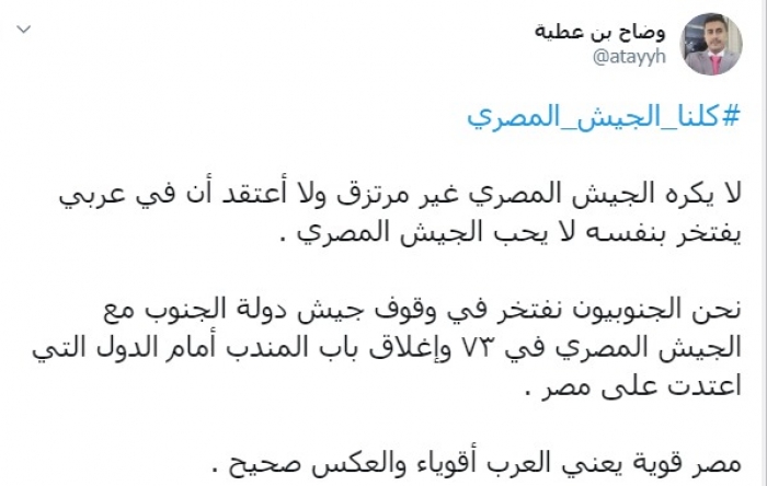 وكتب عبر تغريدة له على "تويتر" رصدها "المشهد العربي": "لا يكره الجيش المصري غير مرتزق ولا أعتقد أن عربيا يفتخر بنفسه لا يحب الجيش المصري، نحن الجنوبيين نفتخر بوقوف جيش دولة الجنوب مع الجيش المصري في 73 وإغلاق باب المندب أمام الدول التي اعتدت على مصر، مصر قوية يعني العرب أقوياء والعكس صحيح".