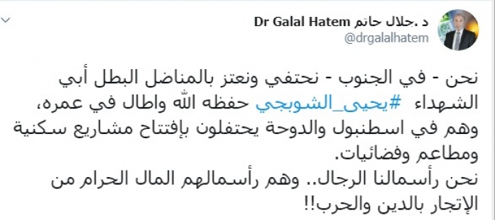 وكتب عبر تغريدة له على "تويتر" رصدها "المشهد العربي": "نحن في الجنوب نحتفي ونعتز بالمناضل البطل أبي الشهداء يحيى الشوبجي حفظه الله وأطال في عمره، وهم في إسطنبول والدوحة يحتفلون بافتتاح مشاريع سكنية ومطاعم وفضائيات، نحن رأسمالنا الرجال، وهم رأسمالهم المال الحرام من الاتجار بالدين والحرب".