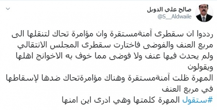 وكتب عبر تغريدة له على "تويتر" رصدها " المشهد العربي": "رددوا أن سقطرى آمنة مستقرة وإن مؤامرة تحاك لتنقلها إلى مربع العنف والفوضى فاختارت سقطرى المجلس الانتقالي ولم يحدث فيها عنف ولا فوضى مما خوف به الإخونج أهلها، ويقولون المهرة ظلت آمنة مستقرة وهناك مؤامرة تحاك ضدها لإسقاطها في مربع العنف، ستقول المهرة كلمتها وهي أدرى أين أمنها".
