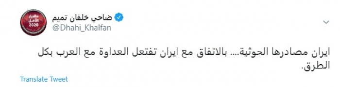 وقال في تغريدة عبر "تويتر" رصدها "المشهد العربي": "إيران مصادرها الحوثية.... بالاتفاق مع إيران تفتعل العداوة مع العرب بكل الطرق".