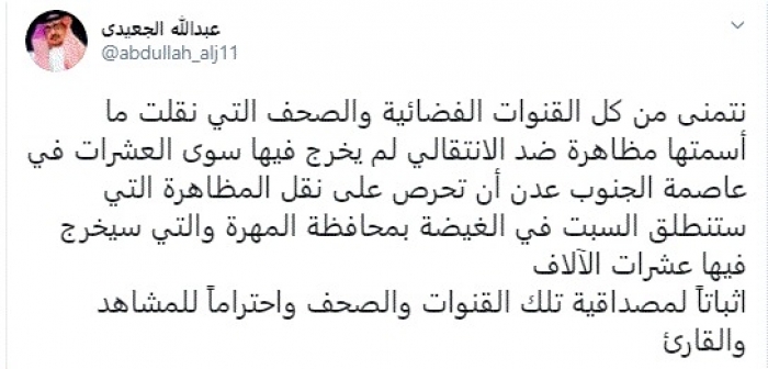 وقال في تغريدة عبر "تويتر" رصدها "المشهد العربي": "نتمنى من كل القنوات الفضائية والصحف التي نقلت ما أسمتها مظاهرة ضد الانتقالي لم يخرج فيها سوى العشرات في عاصمة الجنوب عدن أن تحرص على نقل المظاهرة التي ستنطلق السبت في الغيضة بمحافظة المهرة والتي سيخرج فيها عشرات الآلاف".