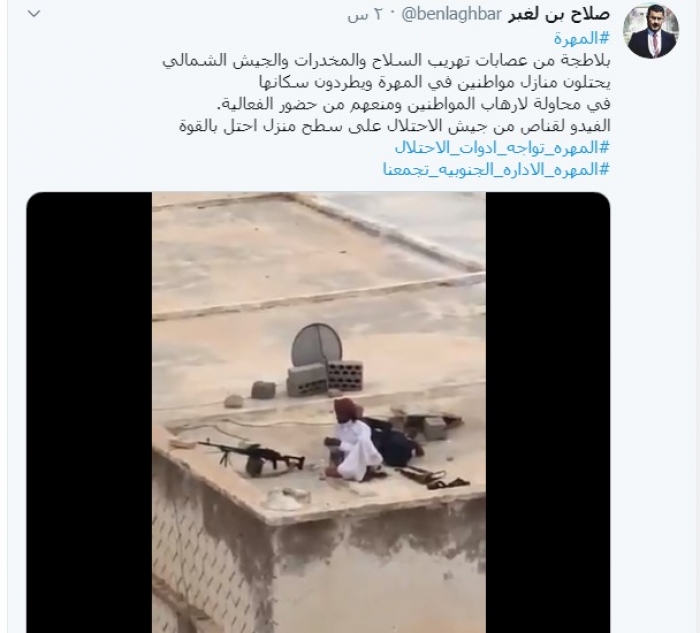 وكتب عبر تغريدة له على "تويتر" رصدها "المشهد العربي": "بلاطجة من عصابات تهريب السلاح والمخدرات والجيش الشمالي، يحتلون منازل مواطنين في المهرة ويطردون سكانها، في محاولة لإرهاب المواطنين ومنعهم من حضور الفعالية".