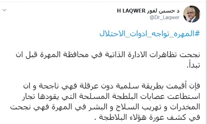 وكتب عبر تغريدة له على "تويتر" رصدها " المشهد العربي": "نجحت تظاهرات الإدارة الذاتية في محافظة المهرة قبل أن تبدأ، فإن أقيمت بطريقة سلمية دون عرقلة فهي ناجحة وإن استطاعت عصابات البلطجة المسلحة التي يقودها تجار المخدرات و تهريب السلاح و البشر في المهرة فهي نجحت في كشف عورة هؤلاء البلاطجة".