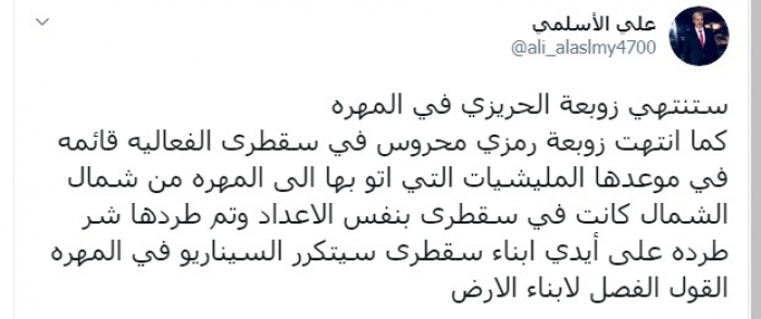 وكتب عبر تغريدة له على "تويتر" رصدها "المشهد العربي": "ستنتهي زوبعة الحريزي في المهرة، كما انتهت زوبعة رمزي محروس في سقطرى، الفعالية قائمة في موعدها، المليشيات التي أتوا بها إلى المهرة من شمال الشمال، كانت في سقطرى بنفس الأعداد وتم طردها شر طردة على أيدي أبناء سقطرى، سيتكرر السيناريو في المهرة، القول الفصل لأبناء الأرض".