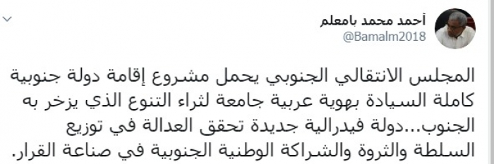 وكتب عبر تغريدة له على "تويتر" رصدها "المشهد العربي": "المجلس الانتقالي الجنوبي يحمل مشروع إقامة دولة جنوبية كاملة السيادة بهوية عربية جامعة لثراء التنوع الذي يزخر به الجنوب، دولة فيدرالية جديدة تحقق العدالة في توزيع السلطة والثروة والشراكة الوطنية الجنوبية في صناعة القرار".