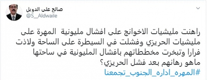 وكتب في تغريدة عبر "تويتر" رصدها "المشهد العربي": "راهنت مليشيات الإخوانج على إفشال مليونية المهرة على مليشيات الحريزي وفشلت في السيطرة على الساحة ولاذت فرارًا وتبخرت مخططاتهم بإفشال المليونية في ساحتها".