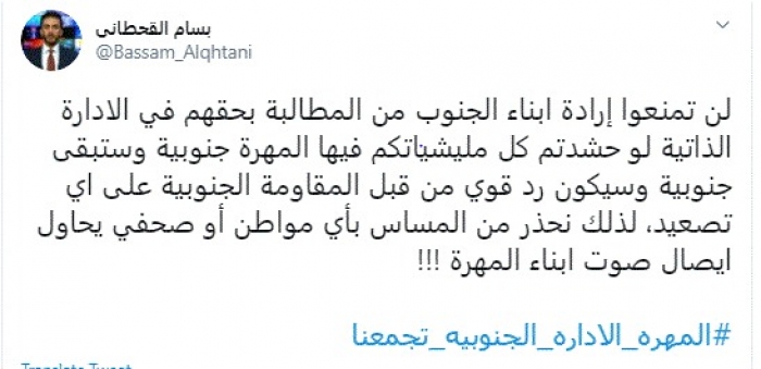 القحطاني لـ الإخوان: لن تمنعوا إرادة أبناء الجنوب.. والمهرة ستبقى جنوبية