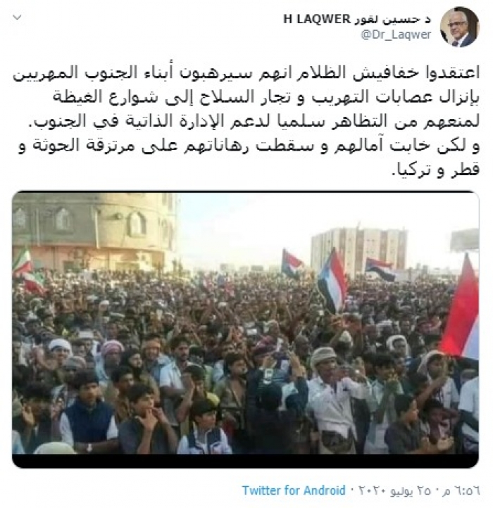 وكتب "لقور" في تغريدة بتويتر، رصدها "المشهد العربي": "اعتقد خفافيش الظلام أنهم سيرهبون أبناء الجنوب المهريين بإنزال عصابات التهريب وتجار السلاح إلى شوارع الغيظة لمنعهم من التظاهر سلميا لدعم الإدارة الذاتية في الجنوب".