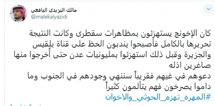 وقال في تغريدة عبر "تويتر" رصدها "المشهد العربي": "كان الإخونج يستهزئون بمظاهرات سقطرى وكانت النتيجة تحريرها بالكامل فأصبحوا يندبون الحظ على قناة بلقيس والجزيرة وقبل ذلك استهزئوا بمليونيات عدن حتى أُخرجوا منها صاغرين أذله".