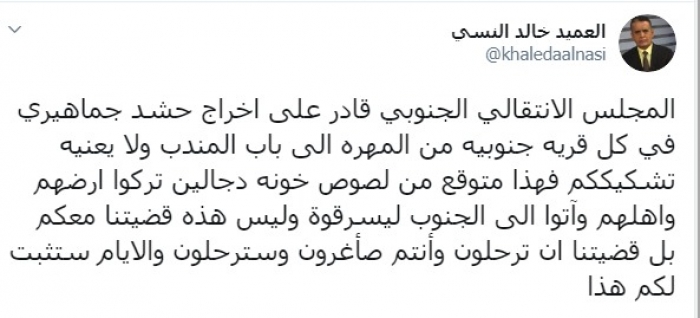 وكتب عبر تغريدة له على "تويتر" رصدها "المشهد العربي": "المجلس الانتقالي الجنوبي قادر على إخراج حشد جماهيري في كل قرية جنوبية من المهرة إلى باب المندب ولا يعنيه تشكيككم فهذا متوقع من لصوص خونة دجالين تركوا أرضهم وأهلهم وأتوا إلى الجنوب ليسرقوه وليست هذه قضيتنا معكم، بل قضيتنا أن ترحلوا وأنتم صاغرون، وسترحلون والأيام ستثبت لكم هذا".