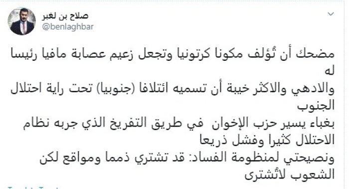 وقال في تغريدة عبر "تويتر" رصدها "المشهد العربي": "مضحك أن تُؤلف مكونًا كرتونيًا وتجعل زعيم عصابة مافيا رئيسا له".