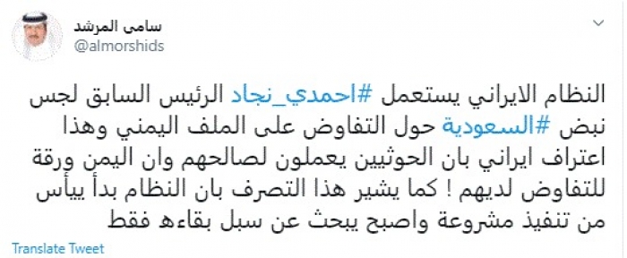 وقال في تغريدة عبر "تويتر" رصدها "المشهد العربي": "النظام الإيراني يستعمل أحمدي نجاد الرئيس السابق لجس نبض السعودية حول التفاوض على الملف اليمني وهذا اعتراف إيراني بأن الحوثيين يعملون لصالحهم".