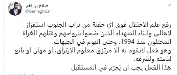بن لغبر: رفع علم الاحتلال فعل يقوم به المرتزقة.. ويجب تجريم ذلك مستقبلًا