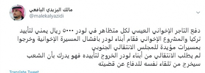وكتب في تغريدة عبر "تويتر" رصدها "المشهد العربي": "دفع التاجر الإخواني العيسي لكل متظاهر في لودر ٥٠٠٠ ريال يمني لتأييد تركيا والمشروع الإخواني فقام أبناء لودر بإفشال المسيرة الإخوانية وخرجوا بمسيرات مؤيدة للمجلس الانتقالي الجنوبي".