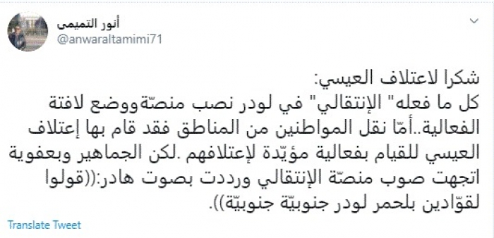 وقال في تغريدة عبر "تويتر" رصدها "المشهد العربي": "شكرًا لاعتلاف العيسي: كل ما فعله الانتقالي في لودر نصب منصّة ووضع لافتة الفعالية".