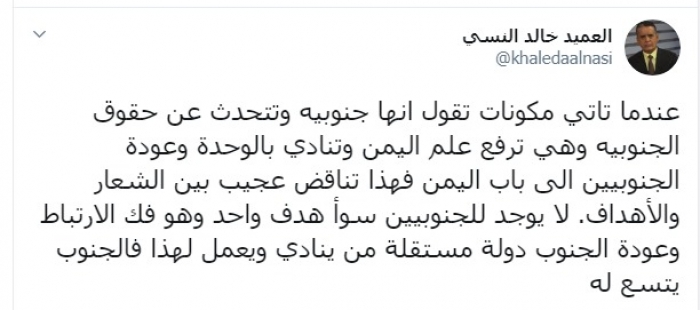 وكتب عبر تغريدة له على "تويتر" رصدها "المشهد العربي": "عندما تأتي مكونات تقول إنها جنوبية وتتحدث عن حقوق الجنوب وهي ترفع علم اليمن وتنادي بالوحدة وعودة الجنوبيين إلى باب اليمن فهذا تناقض عجيب بين الشعار والأهداف، لا يوجد للجنوبيين سوى هدف واحد وهو فك الارتباط وعودة الجنوب دولة مستقلة من ينادي ويعمل لهذا فالجنوب يتسع له".