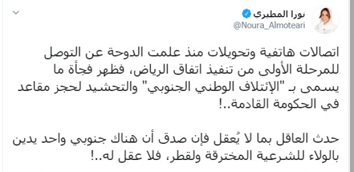 وكتبت عبر تغريدة لها على "تويتر" رصدها " المشهد العربي": "اتصالات هاتفية وتحويلات منذ علمت الدوحة عن التوصل للمرحلة الأولى من تنفيذ اتفاق الرياض، فظهر فجأة ما يسمى بـ "الإئتلاف الوطني الجنوبي" والتحشيد لحجز مقاعد في الحكومة القادمة".