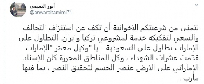 وقال في تغريدة عبر "تويتر" رصدها "المشهد العربي": "نتمنى من شرعيتكم الإخوانية أن تكف عن استنزاف التحالف والسعي لتفكيكه خدمة لمشروعي تركيا وإيران".