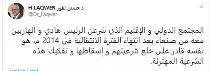 وكتب في تغريدة عبر "تويتر" رصدها "المشهد العربي": "المجتمع الدولي والإقليم الذي شرعن الرئيس هادي والهاربين معه من صنعاء بعد انتهاء الفترة الانتقالية في 2014 م، هو نفسه قادر على خلع شرعيتهم وإسقاطها وتفكيك هذه الشرعية المهترئة".