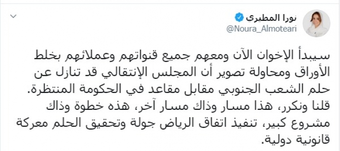 وكتبت عبر تغريدة لها على "تويتر" رصدها "المشهد العربي": "سيبدأ الإخوان الآن ومعهم جميع قنواتهم وعملائهم بخلط الأوراق ومحاولة تصوير أن المجلس الانتقالي قد تنازل عن حلم الشعب الجنوبي مقابل مقاعد في الحكومة المنتظرة، قلنا ونكرر، هذا مسار وذاك مسار آخر، هذه خطوة وذاك مشروع كبير، تنفيذ اتفاق الرياض جولة وتحقيق الحلم معركة قانونية دولية".