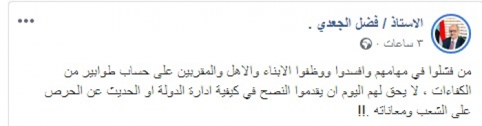 وكتب عبر تغريدة له على "تويتر" رصدها "المشهد العربي": "من فشلوا في مهامهم وأفسدوا ووظفوا الأبناء والأهل والمقربين على حساب طوابير من الكفاءات، لا يحق لهم اليوم أن يقدموا النصح في كيفية إدارة الدولة أو الحديث عن الحرص على الشعب ومعاناته".
