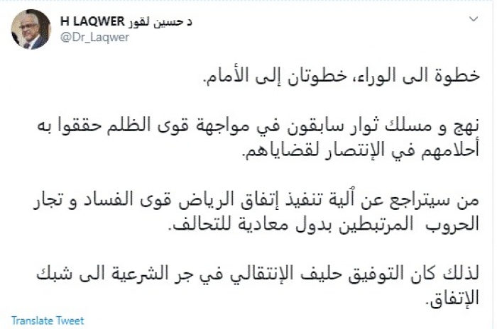 لقور: التوفيق كان حليفًا للانتقالي في جر الشرعية لشبك اتفاق الرياض