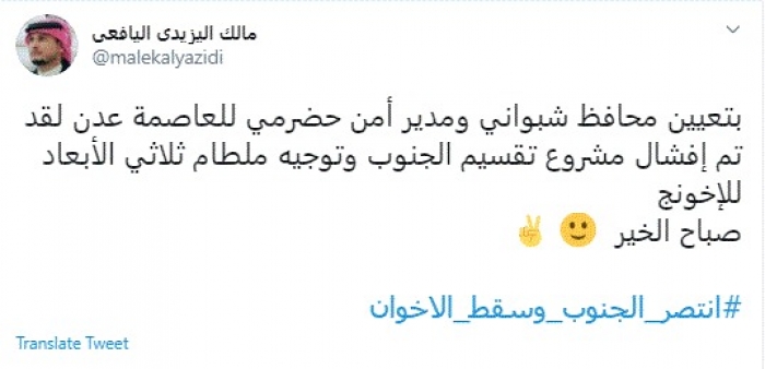 وقال في تغريدة عبر "تويتر" رصدها "المشهد العربي": "بتعيين محافظ شبواني ومدير أمن حضرمي للعاصمة عدن لقد تم إفشال مشروع تقسيم الجنوب وتوجيه ملطام ثلاثي الأبعاد للإخونج".