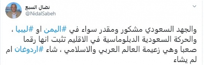 وقال في تغريدة عبر "تويتر" رصدها "المشهد العربي": "الجهد السعودي مشكور ومقدر سواء في اليمن أو ليبيا، والحركة السعودية الدبلوماسية في الإقليم تثبت أنها رقمًا صعبًا وهي زعيمة العالم العربي والإسلامي، شاء أردوغان أم لم يشاء".