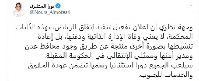 وكتبت في تغريدة عبر "تويتر" رصدها "المشهد العربي": "وجهة نظري أن إعلان تفعيل تنفيذ اتفاق الرياض، بهذه الآليات المحكمة، لا يعني وفاة الإدارة الذاتية ودفنها".