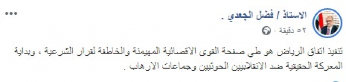 وكتب عبر تغريدة له على "تويتر" رصدها "المشهد العربي": "تنفيذ اتفاق الرياض هو طي صفحة القوى الإقصائية المهيمنة والخاطفة لقرار الشرعية، وبداية المعركة الحقيقية ضد الانقلابيين الحوثيين وجماعات الإرهاب".
