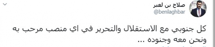 وكتب عبر تغريدة له على "تويتر" رصدها "المشهد العربي": "كل جنوبي مع الاستقلال والتحرير في أي منصب مرحب به ونحن معه وجنوده".