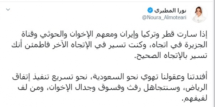 وكتبت عبر تغريدة لها على "تويتر" رصدها " المشهد العربي": "إذا سارت قطر وتركيا وإيران ومعهم الإخوان والحوثي وقناة الجزيرة في اتجاه، وكنت تسير في الاتجاه الآخر فاطمئن أنك تسير بالاتجاه الصحيح، أفئدتنا وعقولنا تهوي نحو السعودية، نحو تسريع تنفيذ اتفاق الرياض، وسنتجاهل رفث وفسوق وجدال الإخوان، ومن لف لفيفهم".