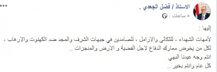 وكتب عبر تغريدة له على "تويتر" رصدها "المشهد العربي": "لأمهات الشهداء ، للثكالى والأرامل ، للصامدين في جبهات الشرف والمجد ضد الكهنوت والإرهاب ، لكل من يخوض معارك الدفاع لأجل القضية والأرض والمنجزات، أنتم وجه عيدنا البهي، كل عام وأنتم بخير".