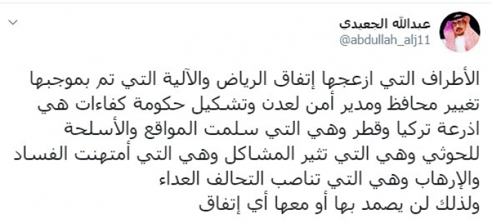 وكتب عبر تغريدة له على "تويتر" رصدها "المشهد العربي": "الأطراف التي أزعجها اتفاق الرياض والآلية التي تم بموجبها تغيير محافظ ومدير أمن لعدن وتشكيل حكومة كفاءات، هي أذرع تركيا وقطر، وهي التي سلمت المواقع والأسلحة للحوثي وهي التي تثير المشاكل وهي التي امتهنت الفساد والإرهاب وهي التي تناصب التحالف العداء، ولذلك لن يصمد بها أو معها أي اتفاق".