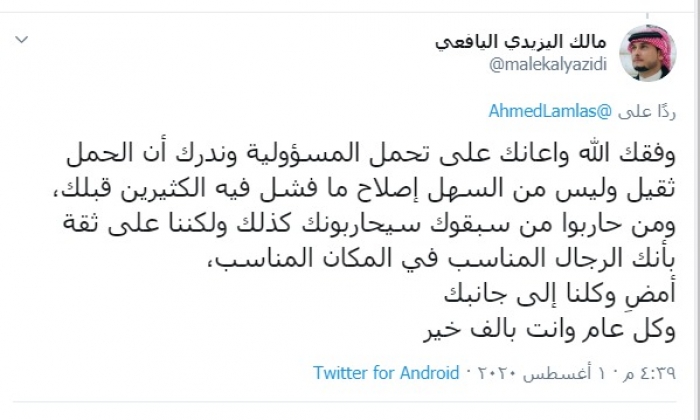 وكتب "اليافعي" في تغريدة عبر حسابه بتويتر، رصدها "المشهد العربي": "وفقك الله وأعانك على تحمل المسؤولية وندرك أن الحمل ثقيل وليس من السهل إصلاح ما فشل فيه الكثيرون قبلك، ومن حاربوا من سبقوك سيحاربونك كذلك ولكننا على ثقة بأنك الرجل المناسب في المكان المناسب، امضِ وكلنا إلى جانبك، وكل عام وأنت بألف خير".