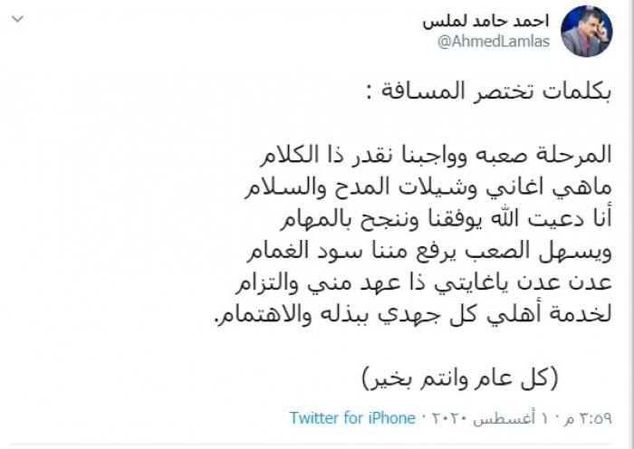 وكتب "لملس" تغريدة عبر تويتر، رصدها "المشهد العربي" قال فيها: "بكلمات تختصر المسافة: