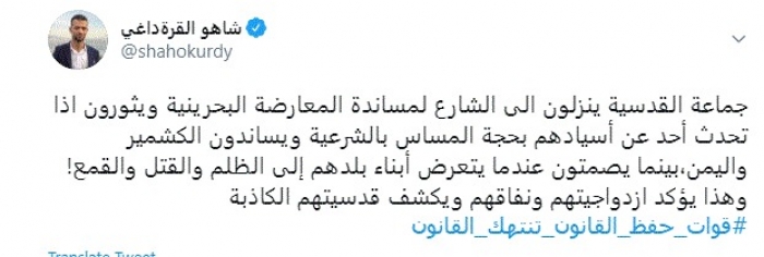 وقال في تغريدة عبر "تويتر" رصدها "المشهد العربي": "جماعة القدسية ينزلون إلى الشارع لمساندة المعارضة البحرينية ويثورون إذا تحدث أحد عن أسيادهم بحجة المساس بالشرعية ويساندون الكشمير واليمن، بينما يصمتون عندما يتعرض أبناء بلدهم إلى الظلم والقتل والقمع".