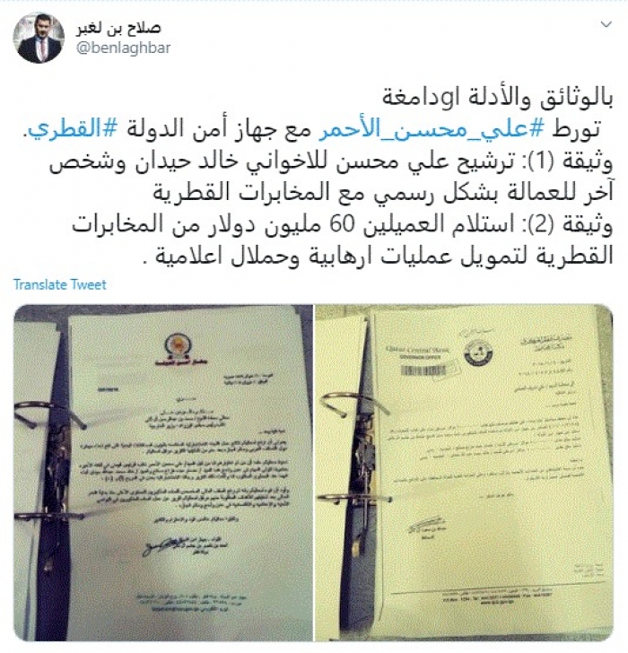 وقال في تغريدة عبر "تويتر" رصدها "المشهد العربي": "بالوثائق والأدلة الدامغة تورط علي محسن الأحمر مع جهاز أمن الدولة القطري".